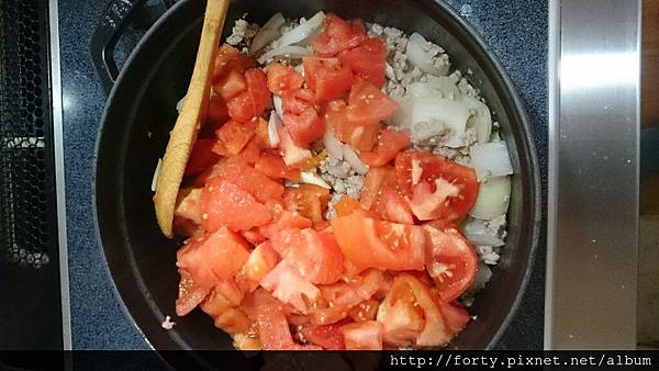 《材料》STA 24吋鑄鐵鍋番茄6大顆洋蔥1大1小粗絞肉約200克大蒜末少許